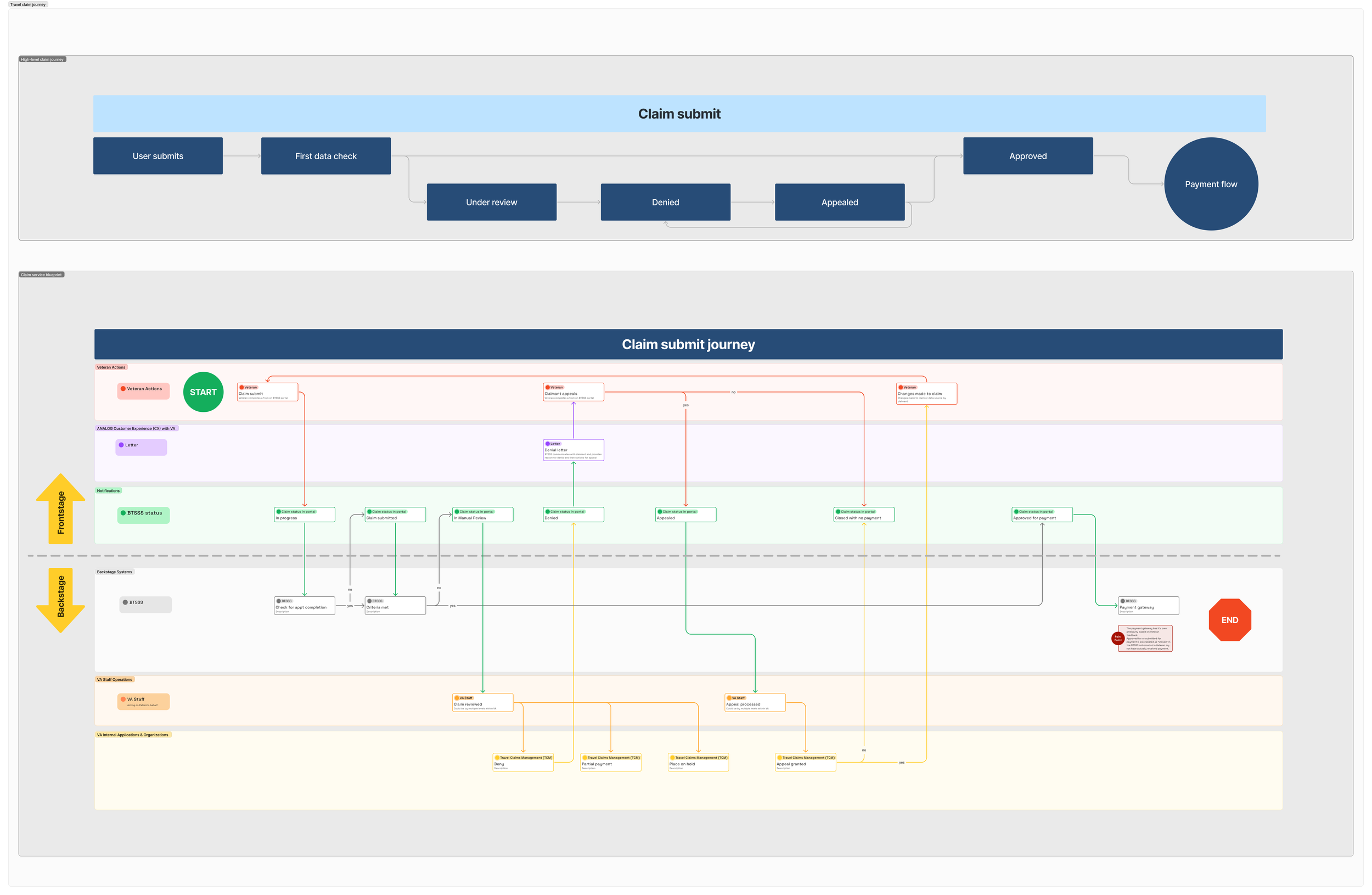 To determine what to build first, the team used service blueprints and journey diagrams that mapped every step of a simple claim, from an appointment to payment. These revealed a repeated problem: Veterans needed visibility, not new functionality. Status transparency became the anchor point.